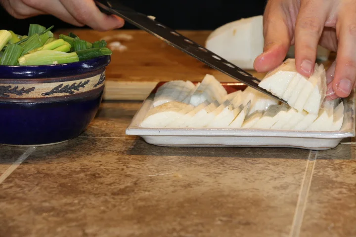 This is some type of spring onion. Cut it into 1 cun chunks like this. Mind your fingers. This adds some yang to the yin of the shan yao. Shan yao sinks, so we lift with garlic and spring onion. This is about the relationship of yin and yang to spark that spleen qi up.
