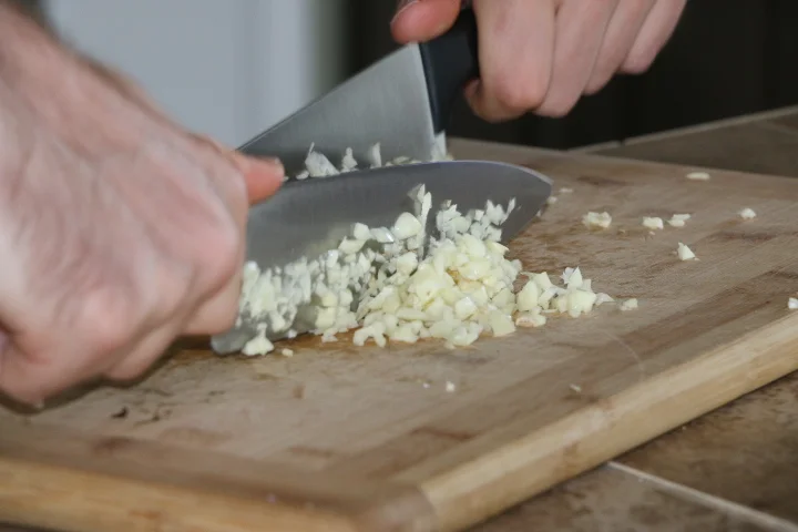 This is garlic. Cut it up. I used two knives because I'm a ninja turtle. Leonardo in this case because he had two swords. Don't let the knives touch, it's bad for them.